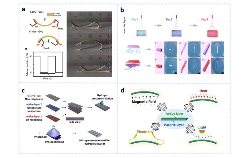 受自然界中生物的启发,能够对周围环境(如湿度、热量、光照、电、磁等)做出响应,产生变形行为(如收缩、膨胀、弯曲、旋转等)的材料,称为刺激响应型材料。刺激响应纤维是纺织材料的基本单元,具有从一维(1D)到三维(3D)的多种可编织性和结构设计性,能够在刺激下表现出从纤维到织物的变形多样性。因此,刺激响应纤维/织物材料可以在驱动、传感和智能服装方面发挥重要作用,并有望实现远程控制、健康监测等重要功能。