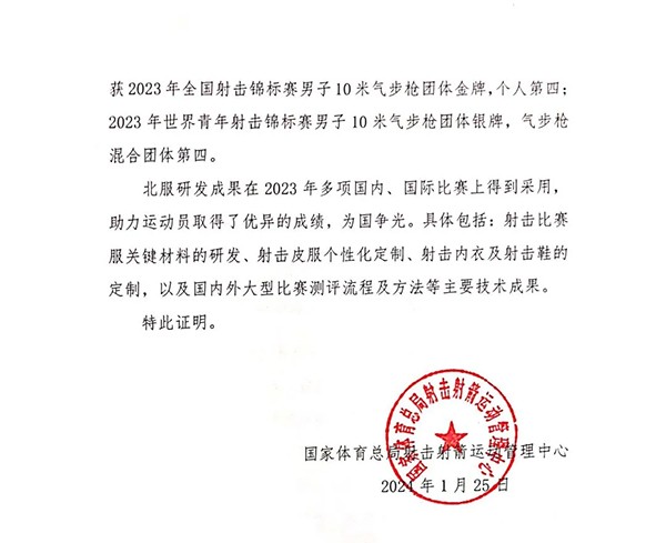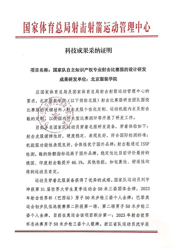 国家体育总局射击射箭运动管理中心提供的科技成果采纳证明