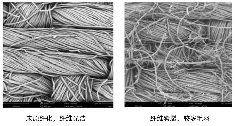 以下为莱赛尔纤维原纤化前后的扫描电镜对比示意图。