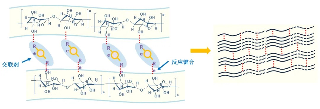 传化化学开创性地发明了“链间锁合”技术,可实现纤维素分子链的深度交联,在印染加工阶段抑制普通莱赛尔原纤化产生,从而改善普通莱赛尔纤维的原纤化问题。其机理模型如下图所示。