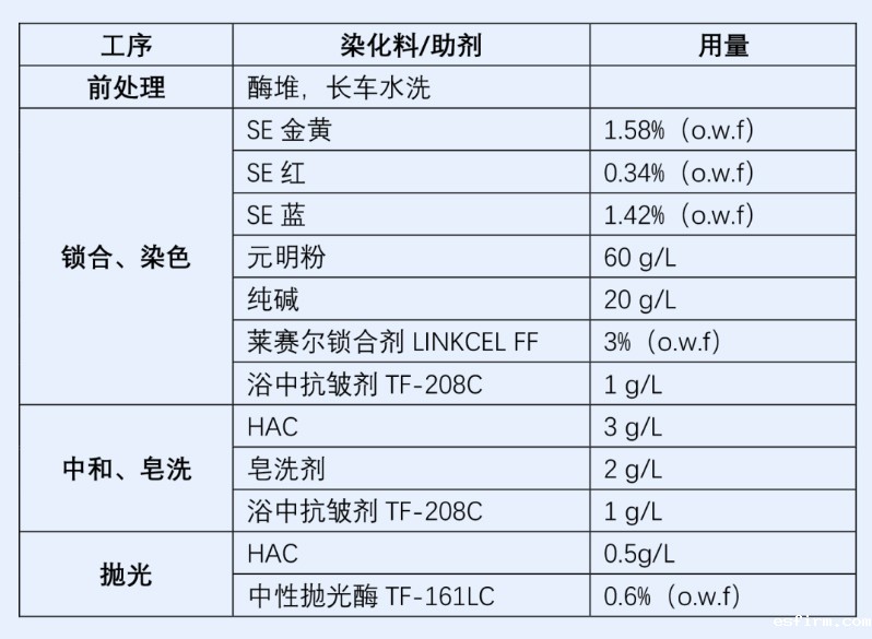 (1)工艺流程的设定上,尽量缩短工艺流程:①莱赛尔纤维几乎无杂质,简单除油工艺即可;②可通过莱赛尔专用的酵素酶来进行抛光,去除染色过程中形成的原纤化绒毛;③抛光和染色同浴进行。