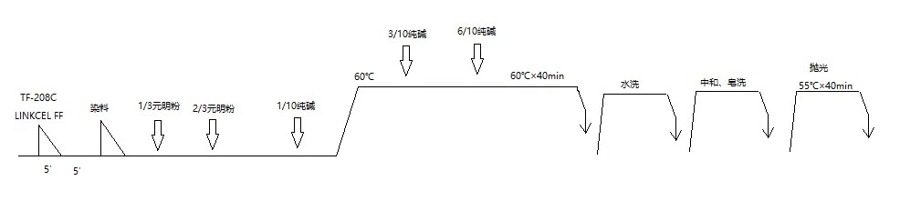 链间锁合技术配套产品目前有3个,适合的应用场景不同,基本可以覆盖散纤维、纱线、面料的染色、印花等各种应用场景。其中:(1)Linkcel FF,用于机缸浸渍染色,和活性染料的染色同浴进行;(2)Linkcel FB,用于长车轧染染色,和活性染料的染色同浴进行;(3)TF-6380A,用于定形整理,和柔软剂同浴整理。