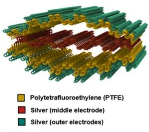 通过收集人体运动的机械能实现自供能与传感一体化,是热湿舒适性功能针织品的另一发展方向,其不仅实现材料与结构协同作用下的动态响应性,也保证了基材的高柔性和穿着舒适性。KWAK等开发了一种完全可拉伸的摩擦电纳米发电机(S-TENG),研究了平针组织、双面组织和罗纹组织结构对摩擦发电性能的影响规律,结果表明罗纹针织物具有更优越的拉伸回复性能和接触面积,受拉伸时产生更大的电压,该织物有望应用于可穿戴服装,捕获人体运动能量,同时具有透气、柔软的性能。