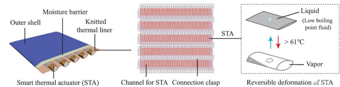 个体防护材料是在极端条件下使人员免受物理、生物和化学等外界因素伤害,包括防火、防寒、防刺、防割以及防生化等方面。研究人员通过工艺设计的二维、三维针织材料,具有整体成形性好的优点,并且保证了穿戴者适当的舒适性和灵活性,在个体安全防护领域具有极大的应用潜力。LIU等受蛇皮重叠结构的启发,编织了仿生鳞片状针织物,不仅具有优异的防刺性能,并且硬质分段鳞片在横、纵向自由扭曲,可较好贴合人体曲面。ZHANG等开发了一种智能热致驱动器(STA),这种自适应性纺织品由热塑性聚氨酯密封驱动,其中嵌入低沸点流体以实现可逆相变,高温时可触发针织基质的膨胀,以增强空气间隔和隔热性,可应用于消防服等极端隔热环境。