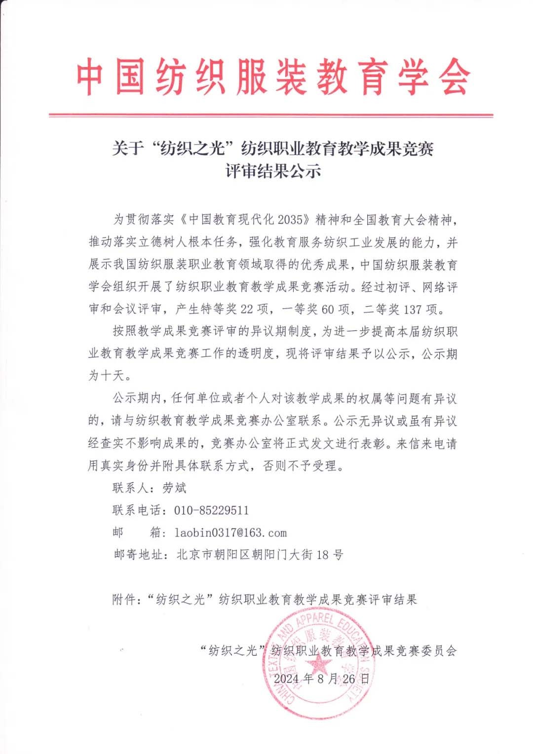 本届教学成果竞赛于6月22日在重庆工贸职业技术学院进行了初赛,由专家对全国49所纺织服装院校和企业申报的294项教学成果进行了审查、分类,经过近400名专家的网评,网评成绩前70%左右的成果进入本次会议评审。经会议评审专家打分、投票,评出特等奖22项、一等奖60项、二等奖137项。