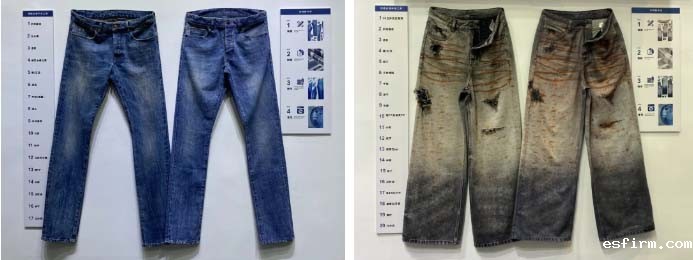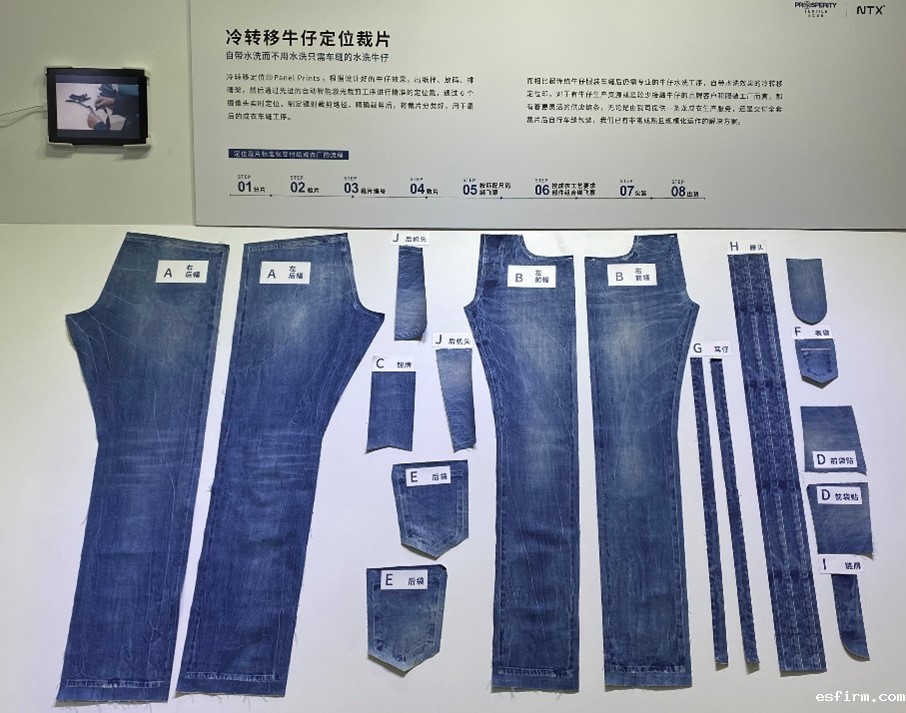 众所周知,水洗是牛仔服装加工中必不可少的工序,也是其核心魅力所在,通过擦、磨、漂、扫、喷、洗等各种工艺的物理和化学作用,赋予了牛仔千变万化的个性风格。然而,传统水洗多达20道的复杂步骤,也会带来效果不可控、重现性差、纤维材料受限、耗水量大等长久存在又难以解决的问题。为此,2022年北江纺织与长胜科技携手成立韶关市蓝星数字纺织科技有限公司,将数字化环保冷转移印染技术全面应用在牛仔领域,并于本次展会革命性地推出了新型“AI水洗牛仔(AIWASH)”。