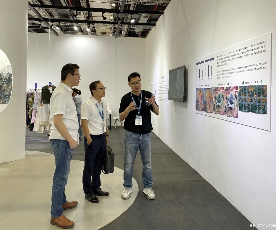 北江纺织市场总监钟章伟(右)在向国家纺织产品开发中心总工程师宋富佳(中)和长胜科技战略发展中心总经理赖彦男(左)介绍冷转移印花牛仔成果