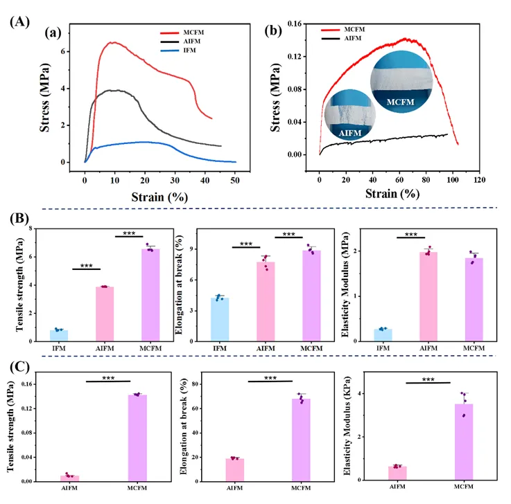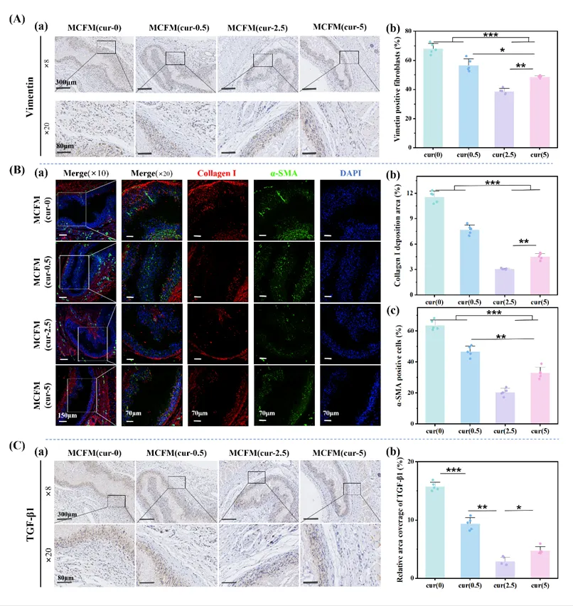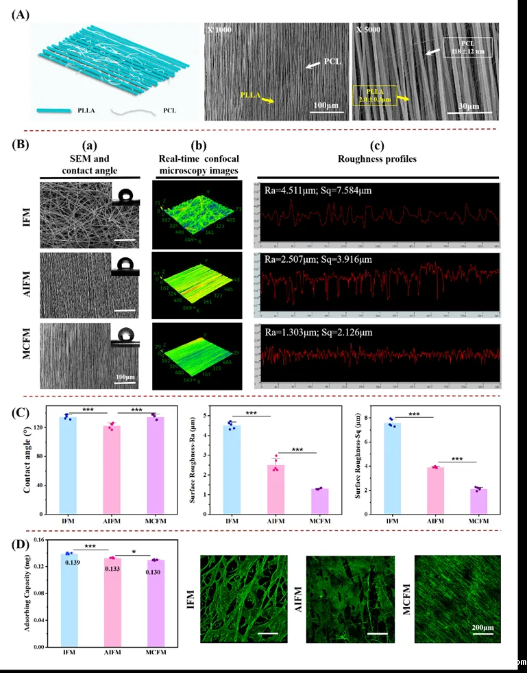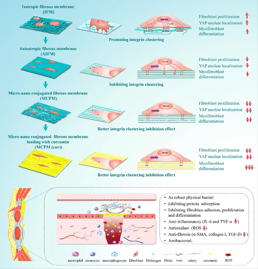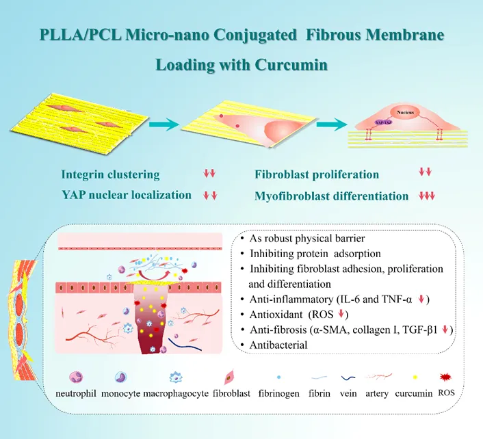 近期,北京航空航天大学樊瑜波教授和李晓明教授在Advanced Functional Materials上发表研究文章《构建负载姜黄素的PLLA/PCL微纳共轭纤维膜从多个角度协同防止术后粘连》。基于同一接收转速下微米纤维和纳米纤维取向度不一致的原理,利用共轭混纺技术构建了负载姜黄素(cur)的聚乳酸-聚己内酯微纳共轭纤维膜(poly-L-lactic acid-poly (caprolactone) micro-nano conjugated fibrous membrane, PAPC MCFM)。其中,低取向的聚己内酯(PCL)纳米纤维((118±12 )nm)贯穿于高度取向的聚乳酸(PLLA)微米纤维((2.0±0.3) μm)之间,对微米纤维在垂直取向的方向上起到了约束和固定的作用。相比PAPC取向纤维膜(anisotropic fibrous membrane,AIFM),PAPC MCFM 不仅显著提高了机械性能,其垂直微米纤维取向方向上的弹性模量和拉伸强度分别提高了4.5倍和13.0倍。还进一步增强了AIFM的“接触引导效应”,即通过抑制整合素β1激活,纽蛋白表达和黏着斑(FA)形成,以及YAP的核定位激活来抑制成纤维细胞的粘附、增殖和分化成肌成纤维细胞。此外,负载2.5 mg/mL姜黄素的 PAPC MCFM还能通过提供抗炎、抗氧化和抗菌功能,并通过减少转化生长因子-β 1(TGF-β1)表达抑制纤维化来进一步预防 POA,在大鼠腹腔和兔硬脑膜下腔中能有效预防术后粘连的发生。