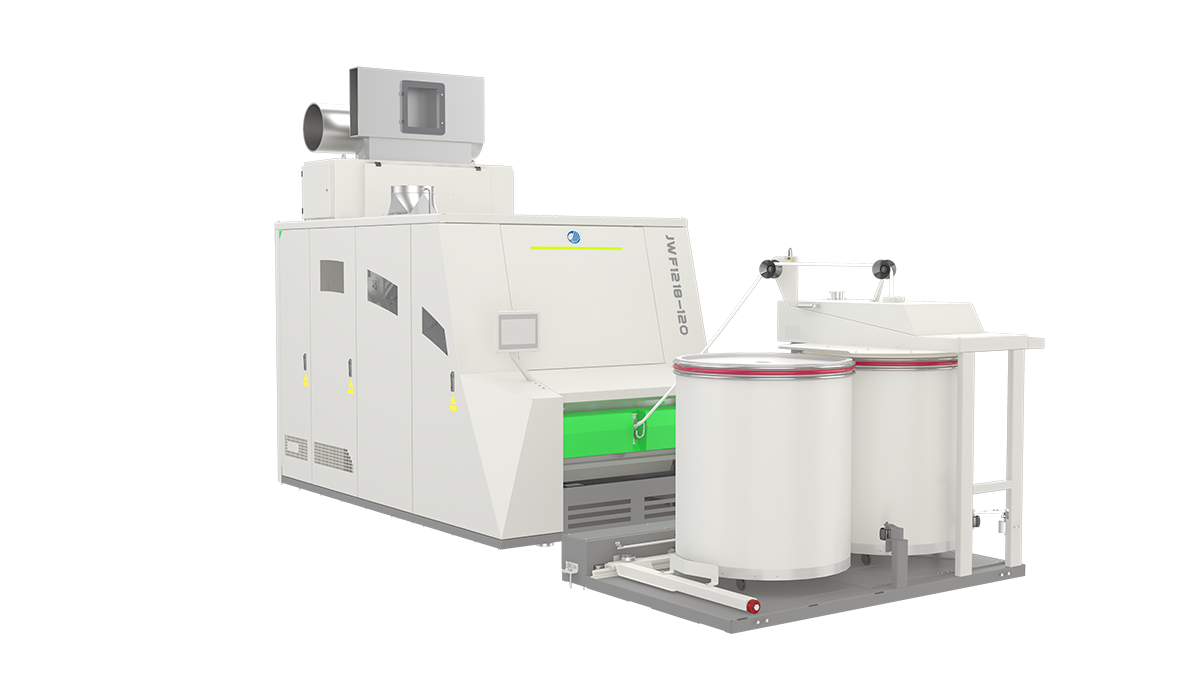 JWF1218型梳棉机是在JWF1216系列梳棉机基础上,融入诸多创新技术,如刺辊区落棉含杂率在线监测、棉网缺陷在线监测、针布状态跟踪、远程技术支持、辅助生头等功能。JWF1218的工作幅宽为1220mm,设计最高出条速度400m/min,理论最高产量200kg/h。
