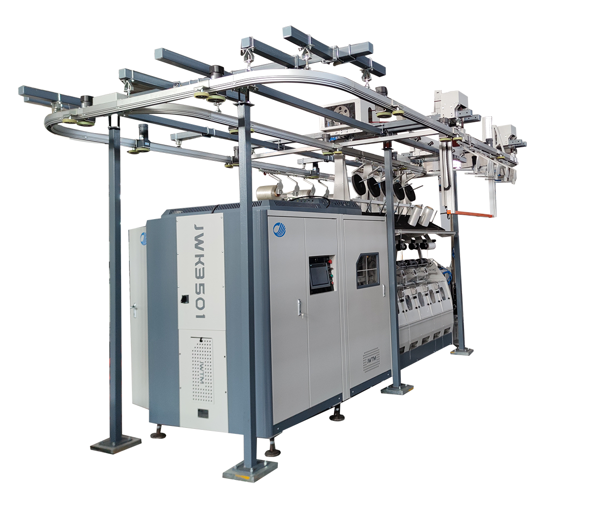 主要特点:联接方式灵活(一对一或者一对多,并排或者穿插,最多可配置4000锭细纱单锭)、管纱质量可追踪、全流程自动输送、节省人工。