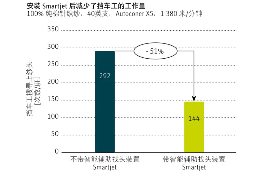 Smartjet辅助找头装置使舞钢龙山纺织AutoconerX5手动上纱找头的工作量降低约51%。