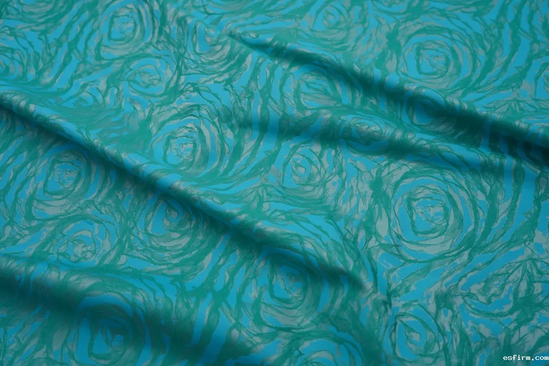 点评:纱线采用涤纶长丝与高支棉纱交织,通过大提花机织工艺与先进的预缩处理后整理技术,既保留了涤纶长丝的光泽和蓬松,又增添了棉纤维的柔软和质感。花型设计以雨滴在湖面上的涟漪流动为灵感,将大写意块面与线描笔触相结合,色彩结合华美的冬绿与温暖怀旧的乳蓝,呈现新鲜而优雅的视觉外观,产品适用于连衣裙、西装、马夹等。