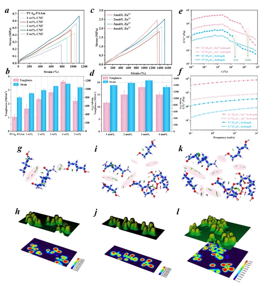 研究首先设计了一种具有三重网络结构的互锁水凝胶,系统探讨了不同纤维素纳米纤维(CNFs)含量及金属离子浓度对材料机械性能的影响。由于CNFs具有较大的纵横比以及分子链间的缠结,过量添加CNFs会导致团聚体的形成,从而引起水凝胶中应力分布的不均匀性,导致机械强度的下降。因此,本研究选定含量为4 wt%的CNFs水凝胶用于后续研究。通过引入增强的金属交联系统,成功构建了三重网络互锁结构,并采用动态流变测试验证了水凝胶的稳定性。所制备的三网络水凝胶的最大拉伸强度可达2.52 MPa,应变达到1520.4%。