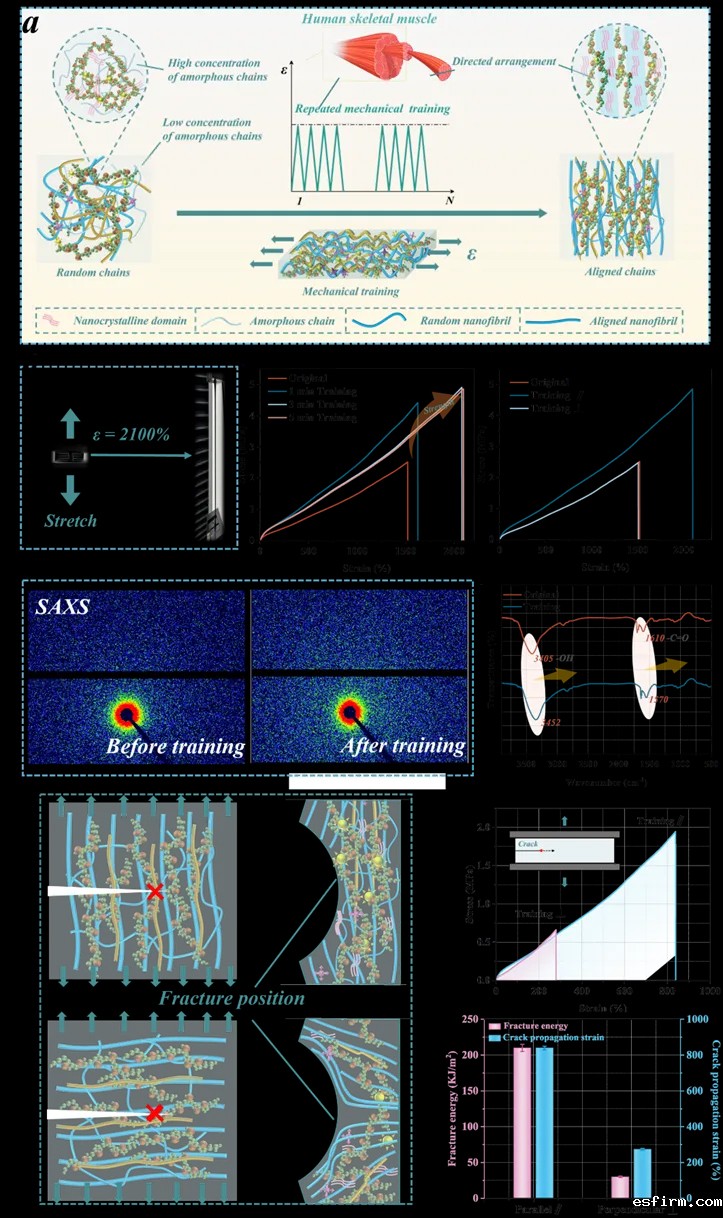 由聚乙烯醇(PVA)、聚丙烯酰胺(PAAm)和纤维素纳米纤维(CNFs)构成的独特三重互锁网络不仅确保了结构的稳定性,同时通过机械训练使分子链定向排列,大幅提升了水凝胶的机械强度和韧性。纳米晶域的形成和重新取向过程使得材料在应对裂纹扩展时表现出卓越的抗疲劳性能。独特的网络设计有效保证了机械训练过程中材料性能的持续增益效果。