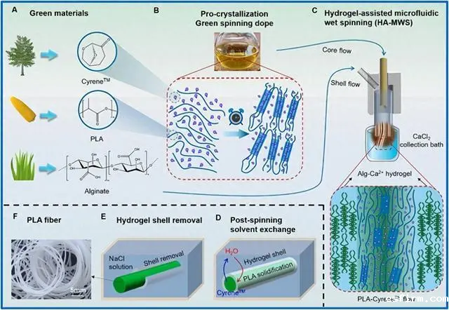 瑞士联邦材料科学与技术研究所的研究团队提出了一种创新的水凝胶辅助微流体纺丝技术。这种新方法采用绿色溶剂,在室温下即可制备出形态可控的PLA纤维。该技术不仅为PLA纤维的室温制备提供了新的途径,也为在纺丝过程中负载生物活性分子、避免使用有毒溶剂等问题提供了有效的解决方案。