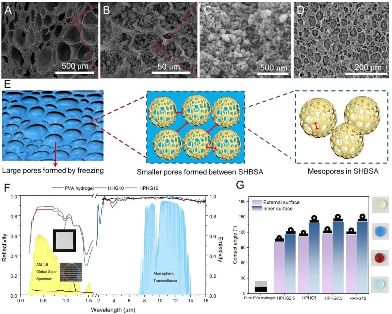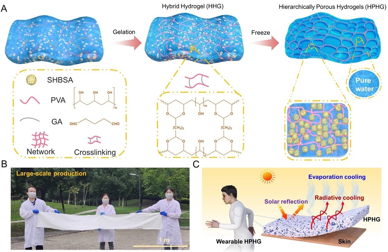 近日,中国科学院苏州纳米技术与纳米仿生研究所王锦研究员、李清文研究员等联合香港中文大学龙祎教授团队设计并制备出一种轻质的多级孔水凝胶(HPHG)。这种水凝胶通过多级孔结构,实现了极端高温环境下,比传统最优辐射制冷材料更好的制冷效果;同时实现了大面积制备与服装穿戴:在直射阳光下,HPHG的表面温度可比环境温度低22.5℃,且冷却时间可长达15小时。研究团队还将HPHG制成一款轻量化冷却背心,重量不足350 g,穿戴后人体皮肤温度平均可比空气温度低11℃。从制作过程来看,将超疏水二氧化硅气凝胶(SHBSA)分散在聚乙烯醇(PVA)水凝胶中,经过反复冻融操作成功制备出HPHG,其厚度仅为毫米级,密度低、力学性能优异,适合大规模生产,并能够制作成轻质、具有一定力学强度无源降温服装。