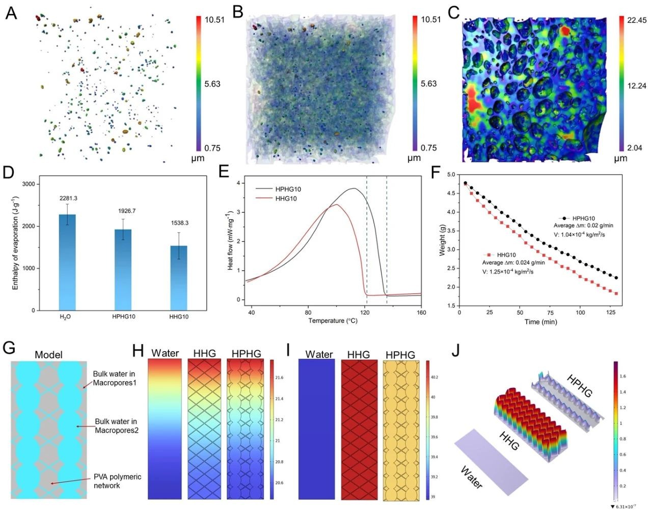 通过X射线显微断层扫描进一步验证了SHBSA聚集体在HPHG内均匀分散以及多级孔结构,这与扫描电镜结果一致。由于水分子与水凝胶网络的相互作用,HPHG10和HHG10的蒸发焓比纯水蒸发焓低(2281.3±247 J/g),但HPHG10蒸发焓较HHG10显著提高25.2%(1926.7±245 J/g)且蒸发速率降低20%,蒸发焓的增加和蒸发速率的降低可归因于分级多孔结构中的大孔。利用COMSOL Multiphysics软件模拟纯水、HHG10和HPHG10在太阳辐射下的变化,可以得出在时间尺度上,它们内部的温度分布以及相应的蒸发速率。