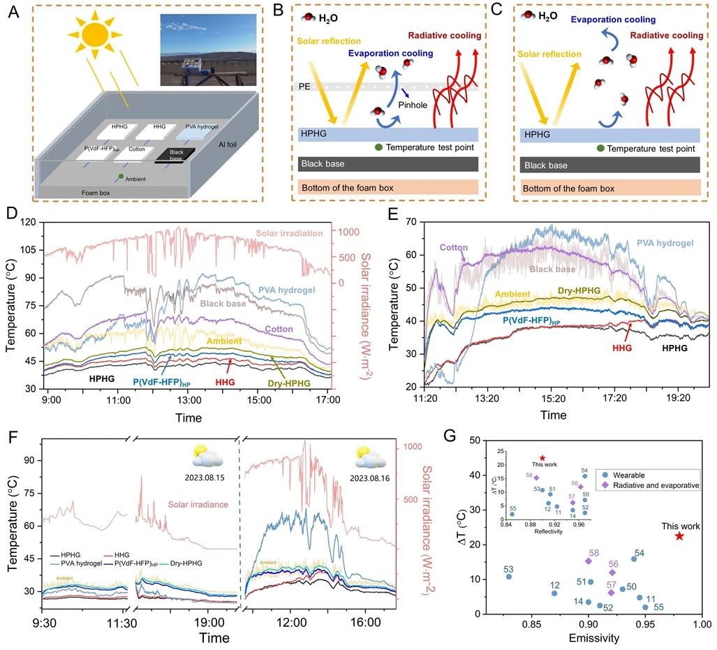 在户外测试中,研究团队采用无对流和有对流两种不同测试方法。结果表明,HPHG在封闭条件下比传统最优辐射降温材料具有更好的冷却效果,最高比空腔内环境温度降低22.4℃,平均和空腔内环境的温差达15.9℃。在吐鲁番45℃的极端高温环境下暴晒(采取完全开放有对流的测试方法),和空气温度相比,HPHG的平均冷却效果达到了8.9℃,最高降温可达14.7℃,而传统最优的辐射制冷材料基本丧失了冷却能力。在多云天气有对流的测试条件下,HPHG可持续15小时降温。