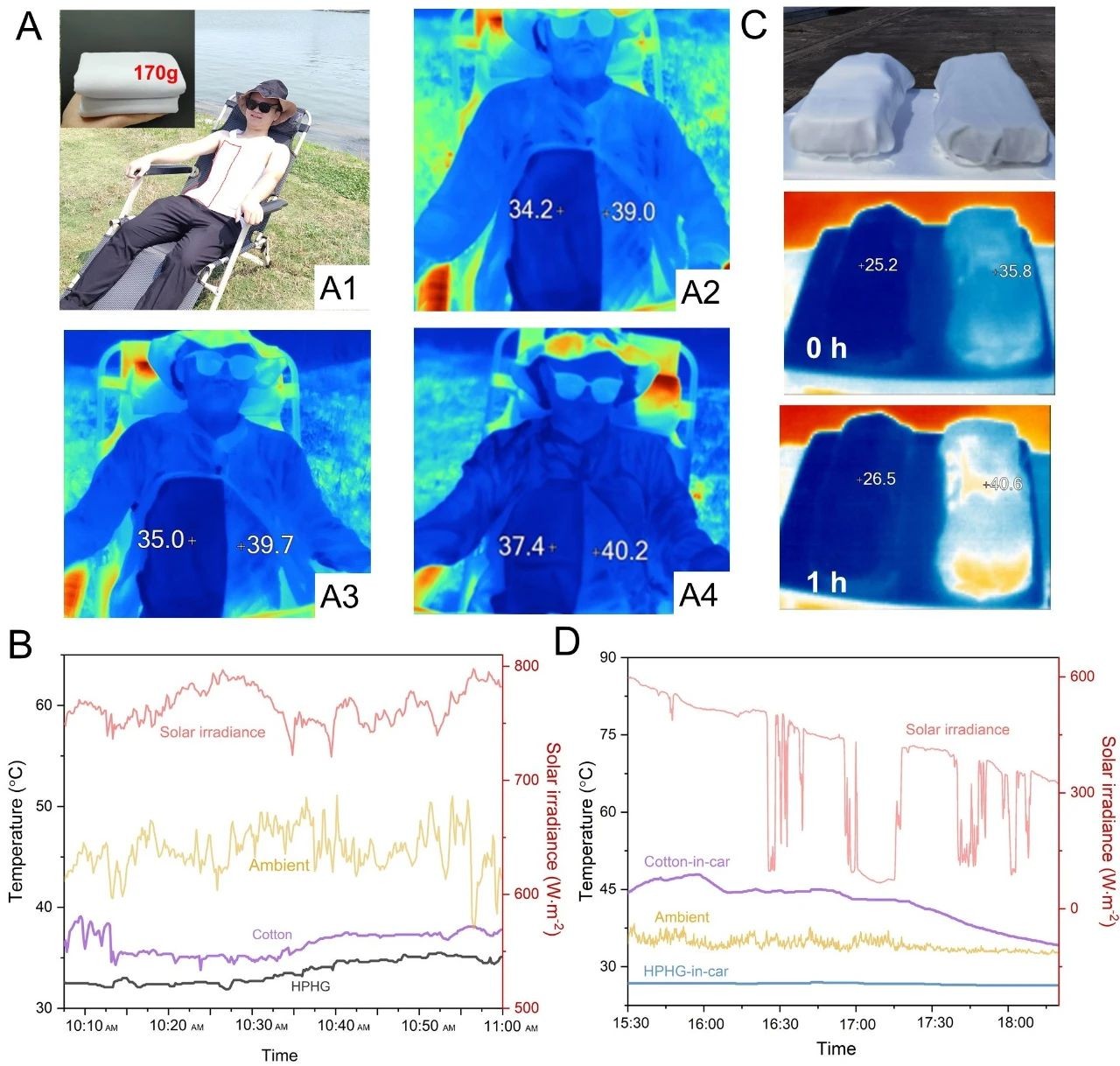 将HPHG10(40×20×0.2 cm,仅170 g)与传统商业棉织物结合制成背心,于2022年7月的炎热夏季(气象学温度高达43℃)进行1小时实验,热成像仪显示1小时后HPHG10温度比棉背心低2.8℃,且HPHG10与人体皮肤间温度维持在舒适的36℃。除了可穿戴冷却性能出色,HPHG10还可用于空间冷却,例如汽车被动日间冷却,约2小时阳光直射实验中,HPHG10覆盖的汽车模型内部最高温度分别比无覆盖和棉覆盖的汽车模型低32.1℃和21.1℃。在库木塔格沙漠(气温飙升至约50℃),HPHG可以将沙子的表面温度(高达68℃)降低29.7℃。