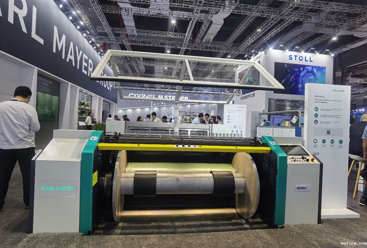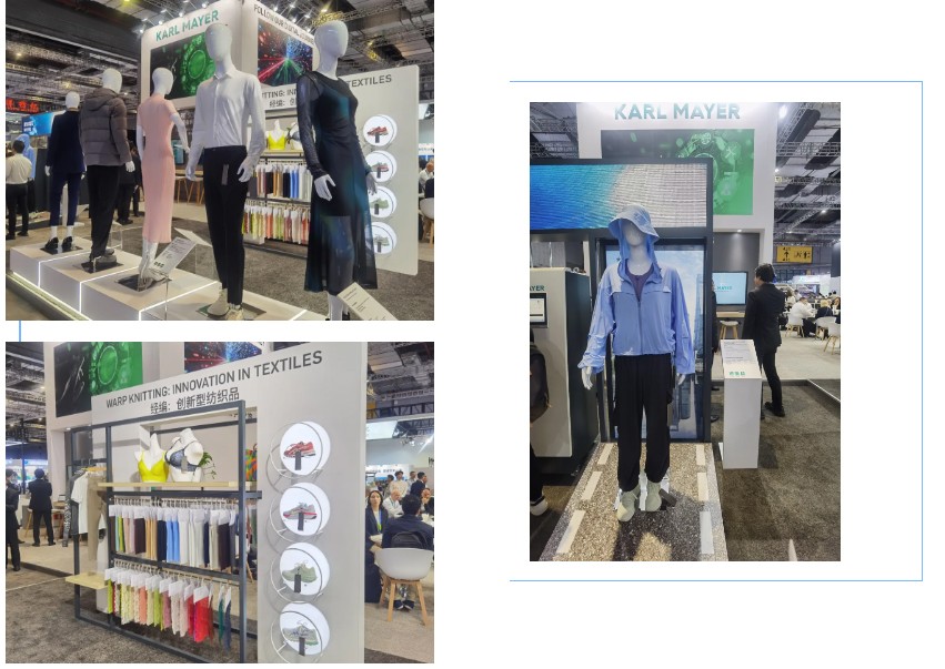 展会现场,卡尔迈耶展出了由HKS 2-SE E40机型生产的面料所制成的功能性且时尚的紧身裤和羽绒服;由HKS 3-M ON E 32机型生产的经编面料制成的时尚女式套装;由TM 2-SE E 36机型生产的面料制成的舒适休闲装等产品;由HKS 3-M ON PLUS和双针床经编机生产的鞋面织物也在展会上亮相;功能性间隔织物也很吸睛,为汽车座椅、床垫内饰和时装提花织物提供可持续解决方案。