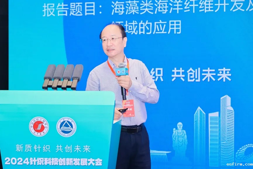 青岛大学教授、国家自然科学基金杰出青年基金获得者夏延致做了题为《海藻类海洋纤维开发及在针织领域的应用》的报告,从研究背景、千吨级海藻纤维产业化、基础研究进展、国家重点实验室平台建设四个方面进行了分享。他指出,高分子材料作为人类生活必需品,年消耗数亿吨,传统陆地生物基材料、石油基材料使用比例逐年下降,海洋生物基材料发展潜力巨大。海藻纤维作为海藻产业与纺织产业的纽带,来源丰富,并具有可生物降解、回潮率高、防霉抑菌、阻燃等性能。报告详细分析了千吨级海藻纤维产业化的制备流程、研发历程、技术瓶颈以及突破的关键技术等,并介绍了海藻纤维在纺织服装、生物医疗、卫生护理、阻燃工程等多个领域实现了应用。