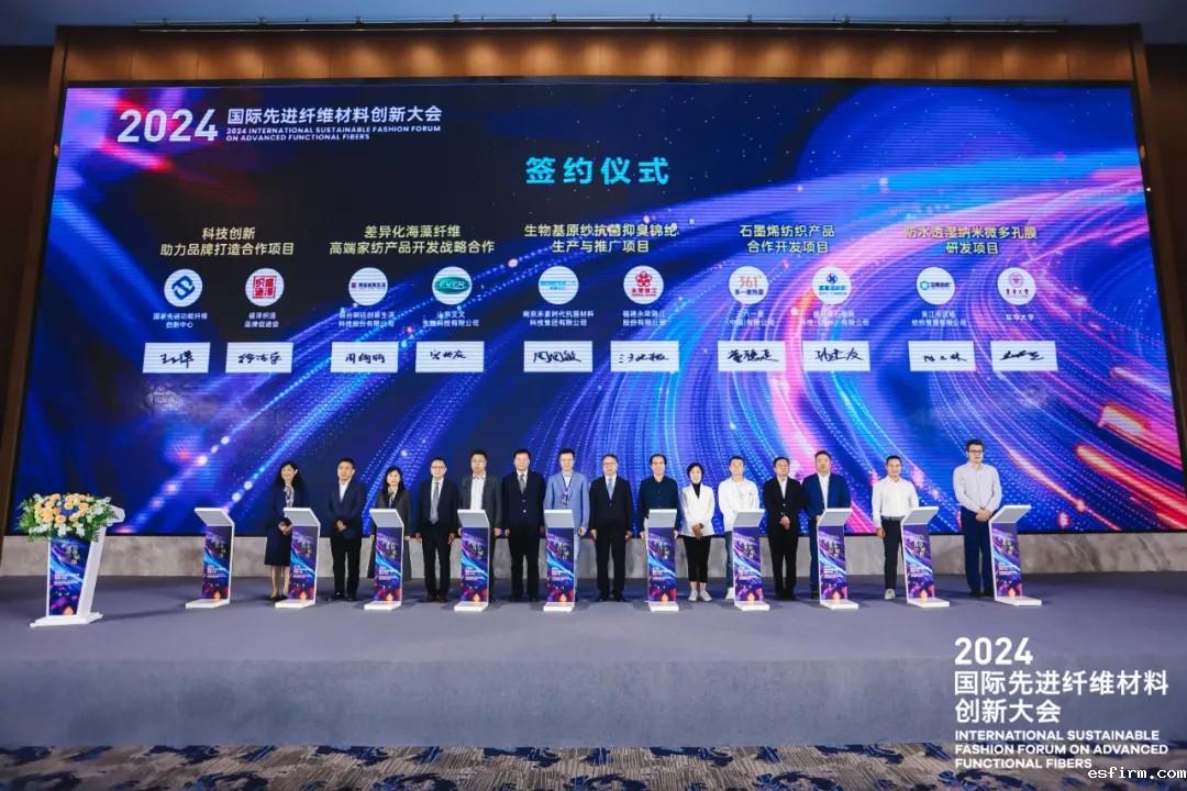 本次会上举行了科技创新助力品牌打造合作项目、生物基原纱抗菌抑臭锦纶生产与推广项目、差异化海藻纤维高端家纺产品开发战略合作、石墨烯纺织产品合作开发项目、防水透湿纳米微多孔膜研发项目、凝聚创新资源形成新质生产力合作项目、超高TiO2含量PET短纤的开发与应用研究项目、差异化功能与智能性针织面料与服装开发项目、NAO虚拟织布机×Sustens®生物基弹力短纤开发合作项目、古法面料工艺传承与时尚创新项目、三川×Sustens®生物基弹力短纤合作项目、元氧能量助眠安睡服开发项目、呋喃基聚酯PEF短纤的研发及产业化项目共13个重点项目的签约仪式。