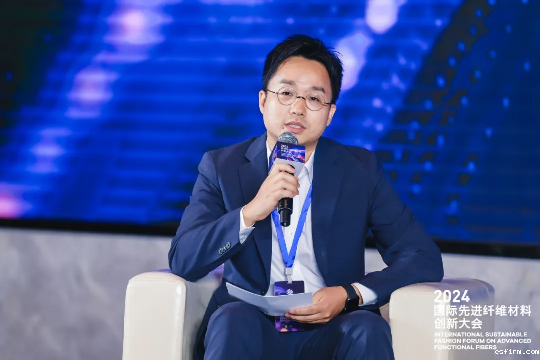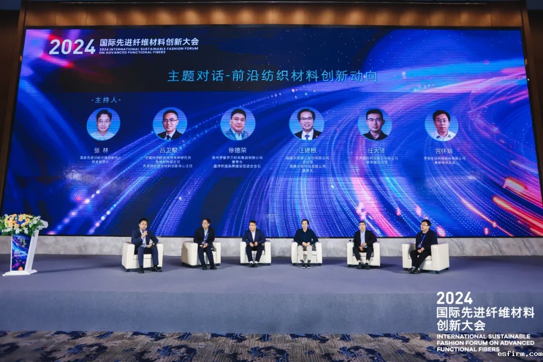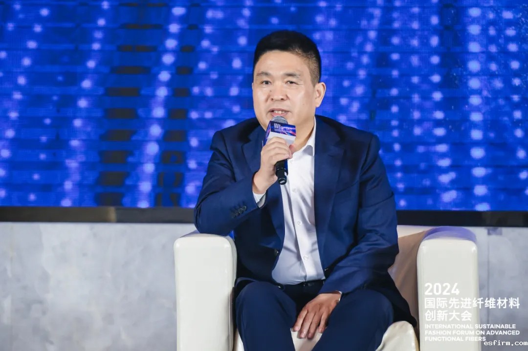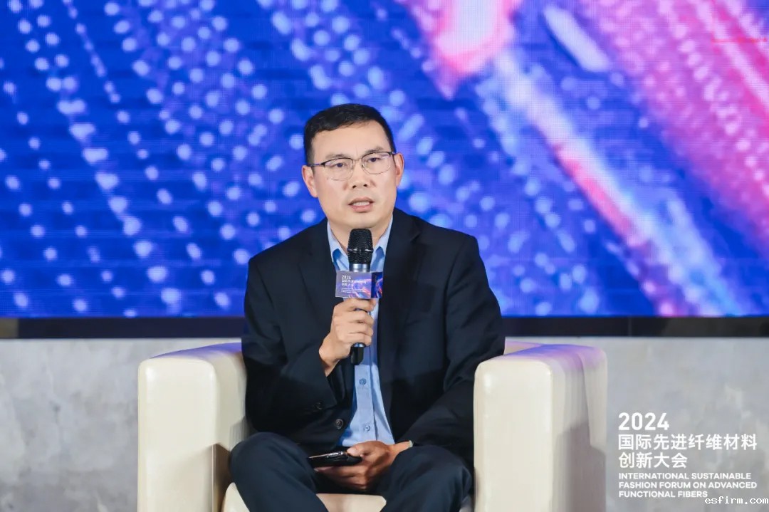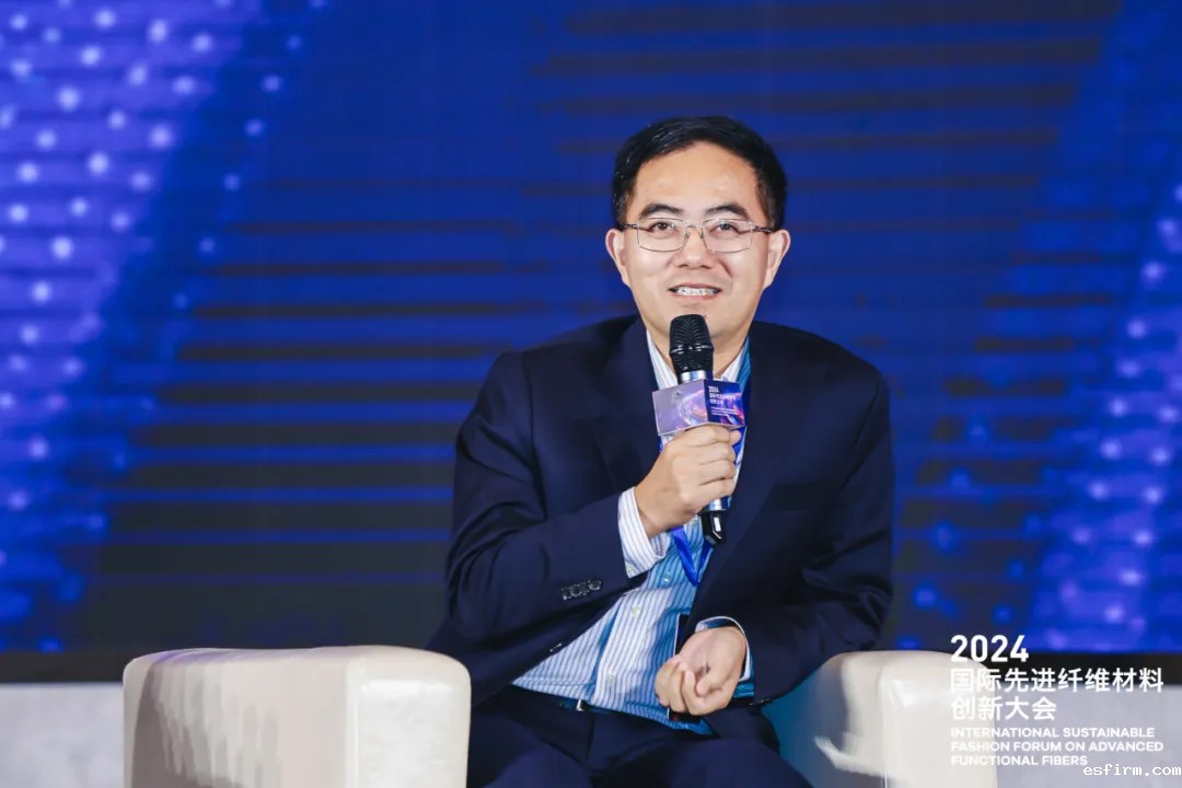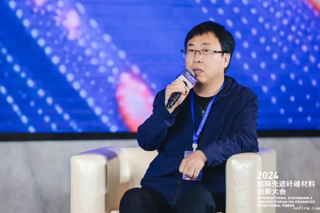在主题对话环节,国家先进功能纤维创新中心研发副部长张林以“前沿纺织材料创新动向”为主题,围绕先进材料的发展情况与应用趋势,与来自纤维、面料和终端应用的企业嘉宾展开了前瞻性探讨。