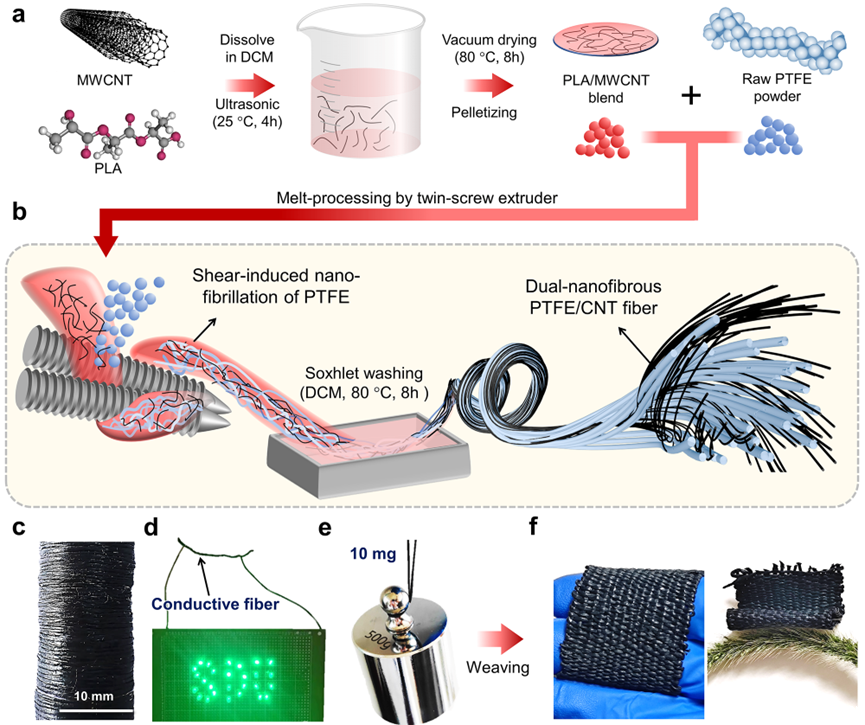 面对这一难题,山东大学王桂龙教授团队创造性地开发了一种基于PTFE原位成纤与碳纳米管(CNT)原位复合改性的工艺,通过灵活的双螺杆共混及牵引纺丝方法,首次实现了高导电填料负载的多孔PTFE复合纤维连续化制备,在工业化生产中具有显著前景。所制备的PTFE/CNT纤维纤细灵活、持久耐用,具有卓越的孔隙率、导电性和力学强度,为个体在极端环境下的安全提供了可靠保障。
