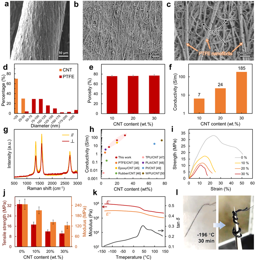 由于PTFE的独特表面特性和疏松的晶体结构,在双螺杆加工过程中PTFE晶体在剪切力作用下容易纤维化为纳米纤维,将熔体挤出后经过牵引纺丝再进行洗涤,从而在所制备纤维内部实现了具有PTFE纳米纤维和CNT两者相互缠绕且各自独立的双纳米纤维微观结构。所制备纤维继承了PTFE和CNT的双重优势,轻质柔软,具有良好的机械强度和高低温使用性。同时,由于取向排列的高含量CNT以及独立的纳米纤维结构共同作用,纤维具有优异的导电性能,这使所编织的纺织品能够实现更多的防护性能与智能化应用。经过测试,该材料的电导率达到185 S/m,拉伸强度高达17.3 MPa,且在极端温度(-150℃到150℃)范围内保持稳定的性能。此外,其高孔隙率(76%)确保了织物的透气性与轻质感,避免使用过程中的不适感。