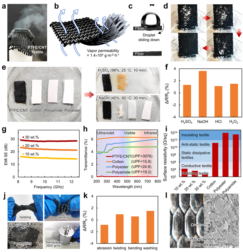 PTFE/CNT纤维织物的透气防水与多效防护性能