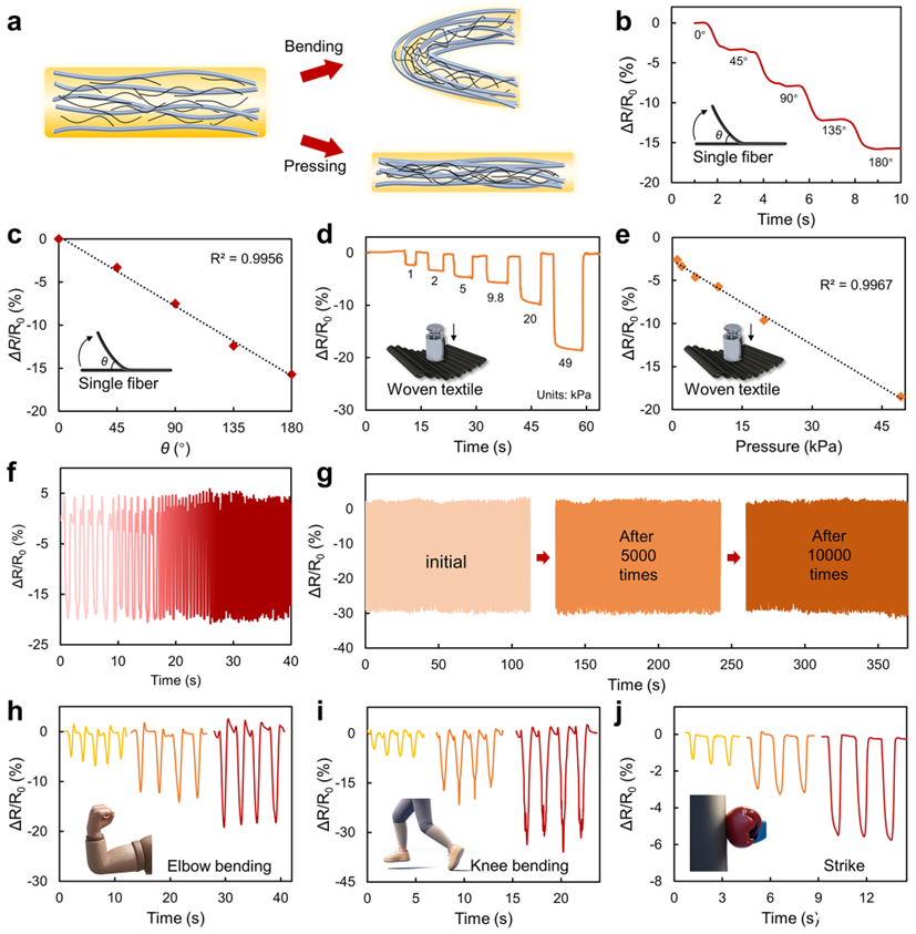该纺织品的电热和光热转换能力具有重要实际应用价值。通过外加电压或太阳光照射,该材料能够快速升温至130℃以上,确保在寒冷环境中提供持久的保暖效果。这种高效的热能管理技术,尤其适用于户外工作者、运动员和军人等需要在低温环境中保持体温的人群。此外,其导电结构不仅使纺织品能够快速升温,还能实时监测温度和机械变形。通过集成于纤维智能传感能力,用户可以监控自己的身体活动,确保在潜在危险中及时做出反应。通过在纤维中集成CNT,这种材料能够有效实现动作与温度的实时感知。当使用者进行各种动作时,例如弯曲、按压或拉伸,织物会迅速响应,改变其电阻值。实验结果表明,该纺织品在不同弯曲角度下的相对电阻变化表现出良好的线性关系,使其能够精确地监测用户的运动状态。在温度监测方面,该材料同样表现出色。研究发现,PTFE/CNT纤维的具有负温度系数,能够精确地感知周围环境的温度变化。当温度升高时,织物的电阻会随之改变,能够用于实时监测周围的温度变化,从而在火灾等紧急情况下提供早期预警。这种智能传感性能的集成使得该纺织品不仅能用作传统服装,还能用于智能穿戴设备,为用户提供更高的安全性和便利性。