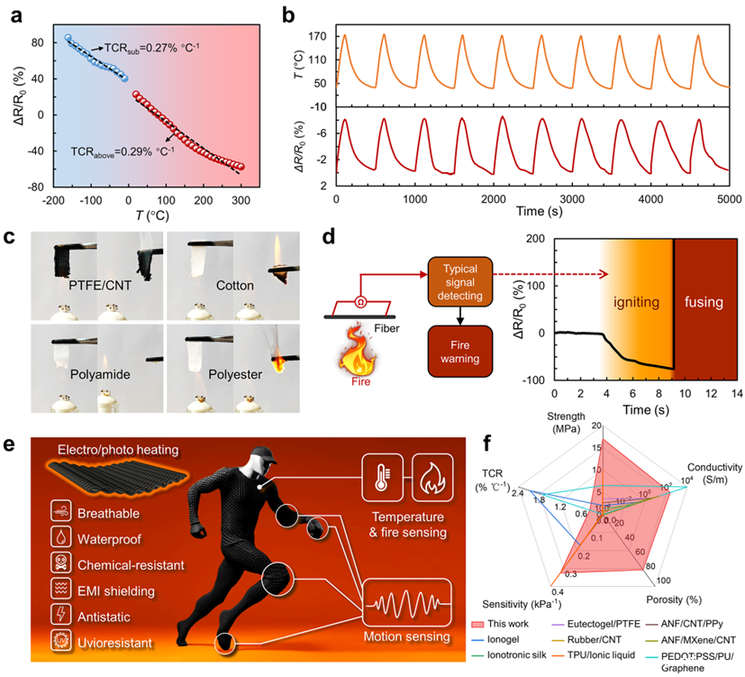 PTFE/CNT纤维织物的温度传感性能及多功能示意图