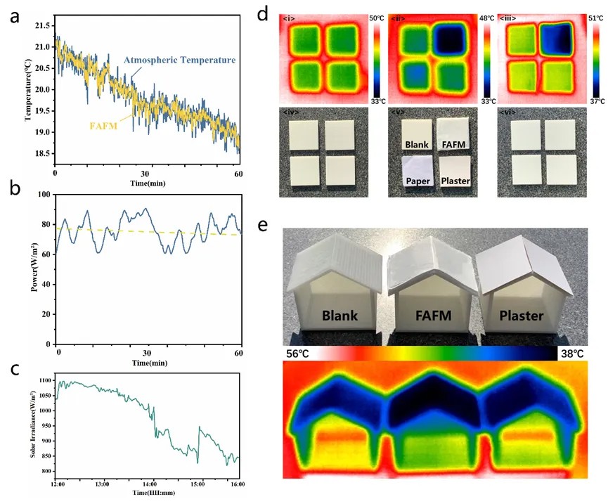 为了评估其实际应用潜力,将FAFM应用于建筑模型,使用红外图像进一步表征了其出色的冷却性能。覆盖FAFM的混凝土板在覆盖材料时和移除后的温度均显著低于其他对照组,这充分证明了其在现实应用中的可行性,表明FAFM在建筑制冷领域具有巨大的潜力。