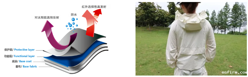 吴江福华织造有限公司推出的Radi-Cool辐射制冷降温面料,采用环保水性涂层整理工艺,实现对太阳能的高效反射(反射率76%~85%)和特定波长(8~13 μm)红外线的选择性高发射(发射率>90%),从而使面料背阴面与向阳面的温差达到15~30 ℃,实现不耗能制冷降温。该面料还具有防紫外、防雨、防霉、耐老化等特点,可用于户外帐篷、车罩、遮阳伞、遮阳帘以及防晒服饰等领域。