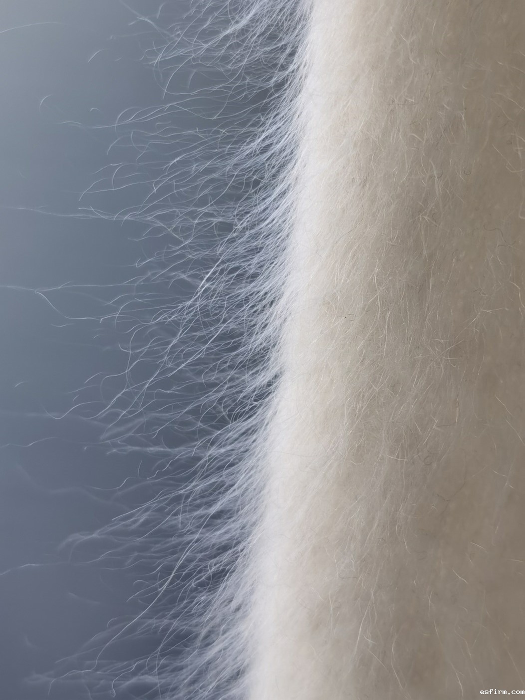 在工艺上,该项技术工艺选用温和的水洗方式,将纱线中的纤维拉出形成自然长毛效果,同时不损害纱线根基,再通过后续特定工艺对拉出的纤维进行定型,使得最终产品具有高的外观顺直飘逸质量和手感。