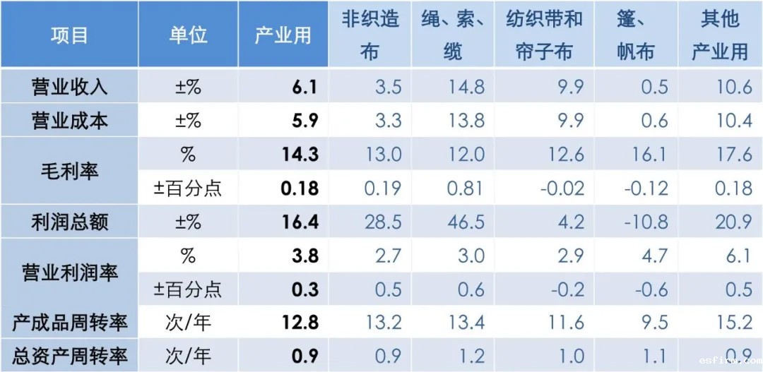 分领域看,1-9月非织造布规模以上企业的营业收入和利润总额分别同比增长3.5%和28.5%,营业利润率为2.7%,同比提高0.5个百分点;绳、索、缆规模以上企业的营业收入和利润总额分别同比增长14.8%和46.5%,增速均居行业首位,营业利润率为3%,同比增加0.6个百分点;纺织带、帘子布规模以上企业的营业收入和利润总额分别同比增长9.9%和4.2%,营业利润率为2.9%,同比降低0.2个百分点;篷、帆布规模以上企业的营业收入同比微增0.5%,利润总额同比下降10.8%,营业利润率为4.7%,同比下降0.6个百分点;过滤、土工用纺织品所在的其他产业用纺织品规模以上企业的营业收入和利润总额分别同比增长10.6%和20.9%,6.1%的营业利润率为行业最高水平(表1)。