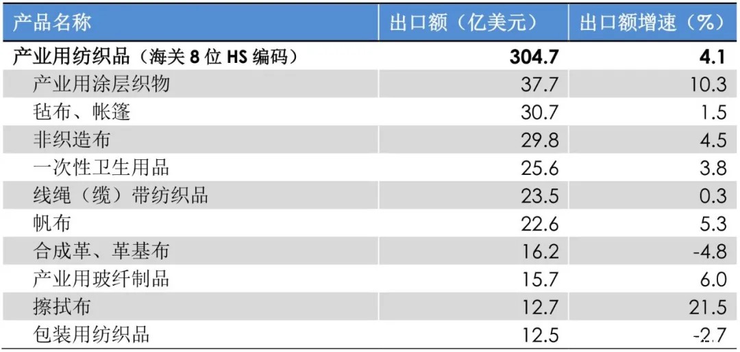 表2 2024年1-9月产业用纺织品行业及主要产品出口情况