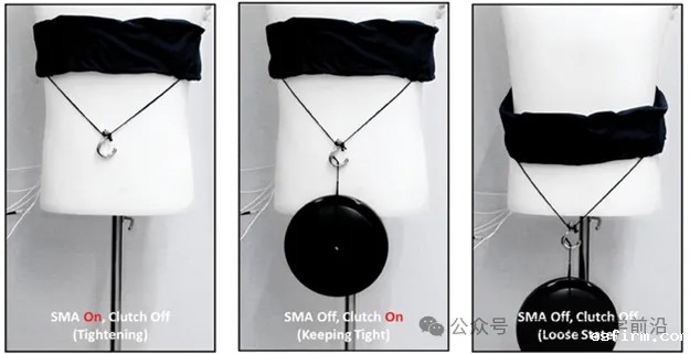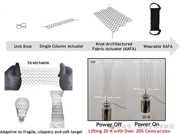 2022年,韩国科学技术院Il-Kwon Oh教授等通过扭结的方式构造了记忆合金导线实现的布料致动器,克服了以往针织面料在这过程中的诸多问题,例如产力效率低、电热不均匀、结构拓扑不稳定。在外力变形之后,通过将电热施加到这款布料致动器后,它会产生收缩,提供可观的收缩力。而且扭结构造的布料致动器本身非常柔顺,可拉伸,轻薄,能够输出足够的机械功用于人体助力场景。如下图所示,通过扭结构造布料,记忆合金导线通过电热变形,实现致动。