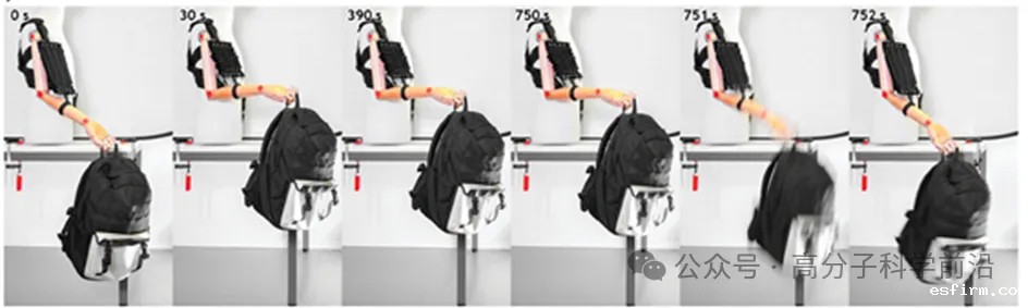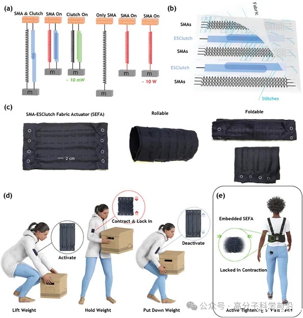 如上图(a)所示,这款致动器的概念非常简单,由于离合器功耗极低(mW级别),用于锁住记忆合金产生的位移,将避免记忆合金在提供静力时的能量浪费。图(b)是封装示意图,将记忆合金与静电离合器封装在布料中,如同三明治夹层。(c)是制备的SEFA,可折叠可弯曲,一如穿在人体身上的布料。(d)和(e)是关于该致动器的应用构想:用于辅助人搬东西或者穿戴紧身的应用。