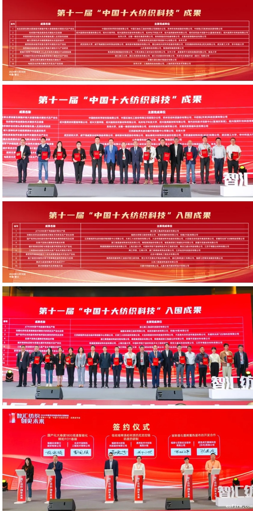 作为此次活动的重头戏,第十一届“中国十大纺织科技”成果发布。经过征集与遴选,“高品质原位聚合原液着色聚酯纤维大容量制备关键技术及产业化”等10个项目脱颖而出。此外,“JCTX300E型千吨级碳纤维生产线”等10个项目获得第十一届“中国十大纺织科技”入围成果称号。
