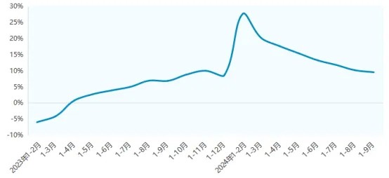 据国家统计局数据,2024年1-9月化纤产量5860万吨,同比增长9.53%(图1)。从环比看,增速呈现逐步回落态势:三季度产量同比增长2.90%;二季度产量同比增长7.61%;一季度产量同比增长20.12%。