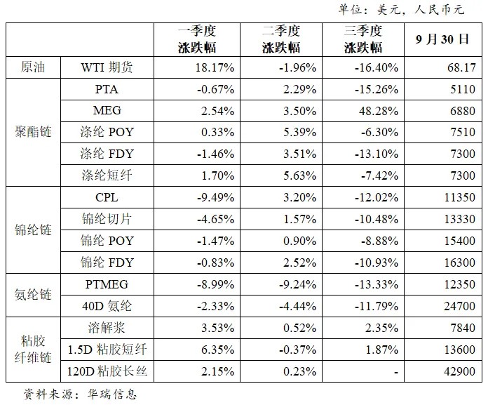 分产业链看,聚酯链、锦纶链三季度跌幅较为明显;氨纶链基本处于下跌趋势;粘胶纤维产业链表现较好,呈现小幅上涨趋势(表1)。