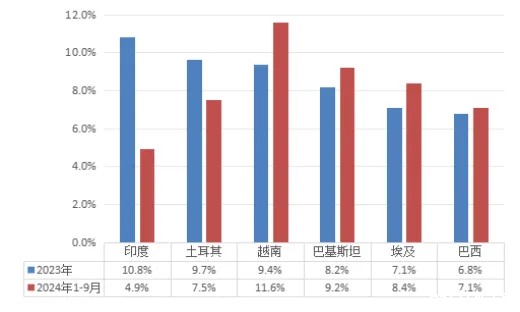 分出口目的地看,化纤出口市场份额变化明显,1~9月出口越南占比11.6%,较去年全年提升2.2个百分点;出口印度占比4.9%,较去年全年下降5.9个百分点;出口土耳其占比7.5%,较去年全年下降2.2个百分点(图4)。此外,聚酯瓶片出口恢复增长态势,同比增长28.31%,出口占比约37%。同期,化纤进口量同比增加5.23%,但数量仅占化纤产量的0.6%。