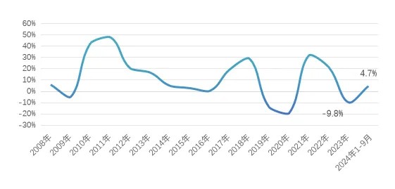 据国家统计局数据,1~9月化纤行业固定资产投资额同比增加4.7%,而2023年同期为-11.6%,低基数效应下投资增速回升。从新增产能来看,聚酯纤维新投116万吨/年,产能增长放缓;聚酯瓶片仍处于扩张周期,新投产342万吨/年,仍有230万吨/年待投。