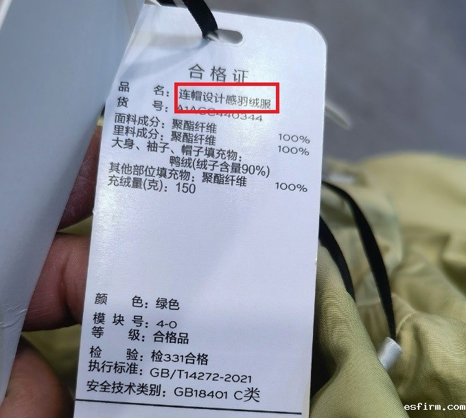 一看产品基本信息。在产品细节方面,产品名称必须是羽绒服,其他如羽丝棉、羽绒棉等都不是羽绒产品,同时还要查看产品吊牌是否清晰标明执行标准(新国标为GB/T 14272-2021《羽绒服装》)、制造商名称、地址等重点信息。