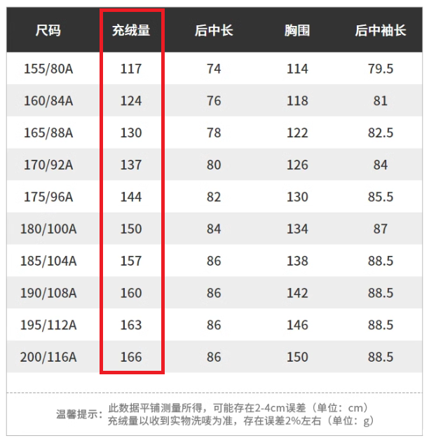 四看充绒量。充绒量是指羽绒服中羽绒重量。充绒量越高,表示填充的羽绒越多,能容纳的静止空气越多,则保暖性就越强。但充绒量过高,羽绒服外观臃肿,影响整体美观,成年人齐腰羽绒服薄款、初冬款和厚款羽绒服充绒量一般为80g、120g、160g。而填充飞丝或粉碎毛的劣质产品,为了获得与正品相似的蓬松效果,充绒量会增高,与正品区别明显。