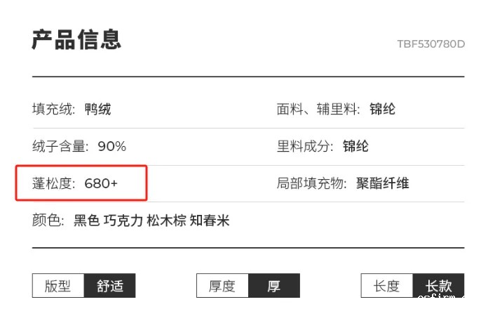 五看蓬松度。蓬松度越高的羽绒服隔绝层固定的空气越多,保暖性能越好,市面上羽绒服的蓬松度一般分为550、600、700、800和900,蓬松度大于800即为高品质羽绒。对于吊牌中未标明蓬松度的产品,可将羽绒制品放松铺平,让其自然恢复三分钟,再用手按压制品,随即将手松开,如果能很快回弹恢复原状,可说明羽绒服的蓬松度比较好。