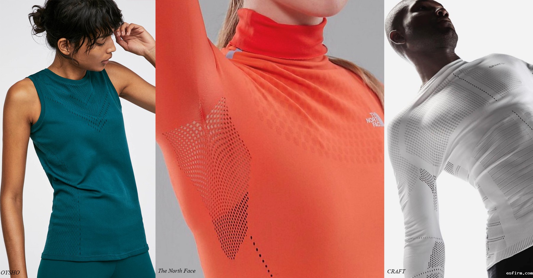 国外在经编全成形运动服装开发的时间早且产品类型以及品牌数量相对较多,虽然每一季新品仍然以单品为主,但是都以具体应用场景进行了服装用途的细分,例如室内健身服、瑜伽服、骑行服、高尔夫运动服、户外运动贴身服、泳装、休闲运动装等,主要覆盖用于室内居家运动或日常休闲运动场合穿着的内衣类和中衣类产品,如Adidas的运动内衣,Nike和Lululemon的紧身裤等。