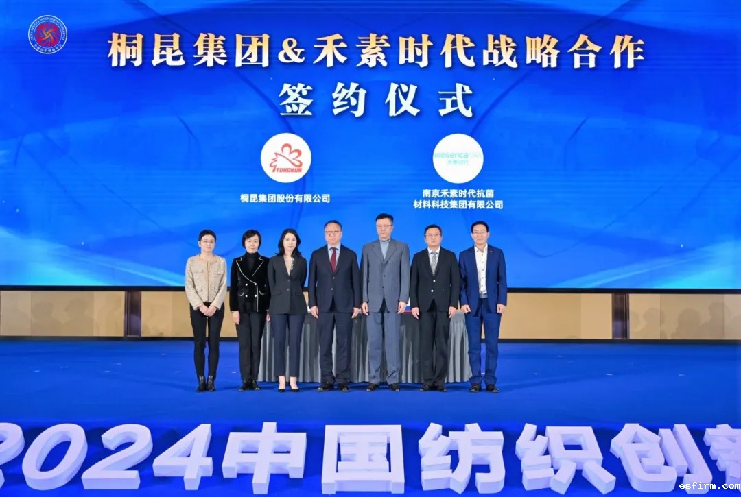 桐昆集团股份有限公司与南京禾素时代抗菌材料科技集团有限公司在会上达成了“关于生物基原纱抗菌抑臭涤纶长丝及短纤生产与推广”的战略合作。作为全球化纤行业龙头与生物基抗菌纤维的引领者,双方将充分发挥自身特色优势,深化在工艺创新、技术应用、市场推广等领域的协同合作,共同推动创新成果技术价值向商业价值的转化升级,引领绿色健康纺织消费新潮流。