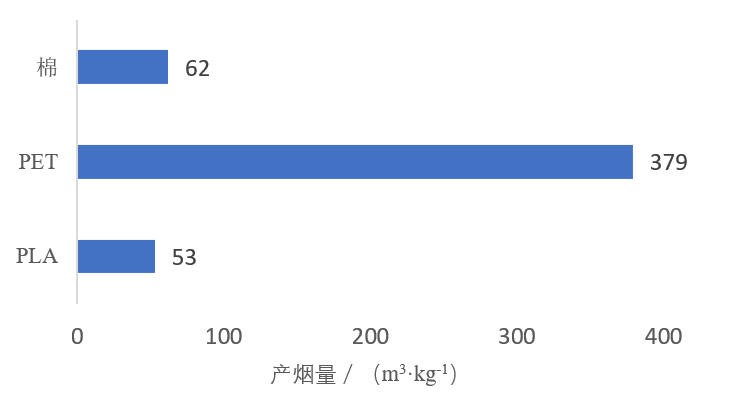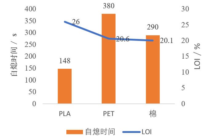 聚乳酸纤维独特的性能也决定了其在家纺领域的竞争力。在家纺领域,难燃、少烟是区分聚乳酸纺织品与传统石油基化学纤维纺织品的关键。从图中可以看出,与传统材料相比,聚乳酸纤维LOI指数为26%,难燃,即使燃烧但发烟量小、无黑烟,特别适合于用作地毯、窗帘、墙布等家装用品。
